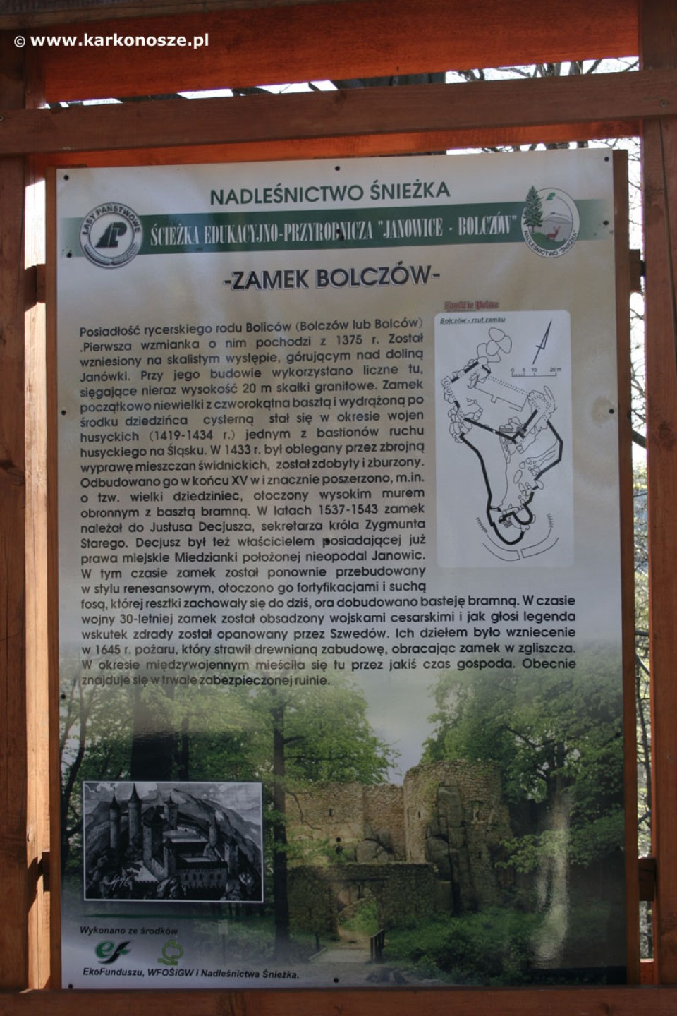 Zamek Bolczów. Pod koniec XIV wieku, w okolicy Janowic Wielkich, został postawiony zamek warowny Bolczów, który obecnie jest jedną z ciekawszych ruin na terenach bliskich Karkonoszy, a w dodatku dostępnych zupełnie bezpłatnie. Do ruin prowadzi pieszy szlak wśród lasu i świeżego powietrza, a w przypadku gdy dysponujemy czasem i siłami, można kontynuować wycieczkę z Janowic Wielkich przez zamek Bolczów aż do Krzyżnej Góry, z której rozpościerają się piękne widoki. Na zamku często, w sezonie letnim, urzęduje młodzież, wykorzystując ruiny jako miejsce biesiad przy ognisku. Dawniej, jeszcze przed II Wojną Światową, ruiny były nie tylko udostępnione do zwiedzania, ale również specjalnie do tego celu przystosowane – we wnętrzu znajdowała się karczma. Obecnie jedynym śladem dbałości o ruiny jest tablica informacyjna, z której można przeczytać historię zamku. Na wycieczkę w okolicę Bolczowa najlepiej wybrać się pociągiem lub samochodem do Janowic Wielkich i stamtąd pieszo skierować się do ruin. Jeżeli dysponujemy samochodem, najlepiej również rozpocząć od „centrum” Janowic, zaparkować przed lasem i podążyć spacerowym krokiem pod bramę zamkową.